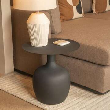 Show moreIntroducing the Creative Co-Op Metal Textured Side Table, a stunning addition to your home that embodies modern design. Crafted meticulously with a striking black textured finish, this charming piece boasts a perfect blend of aesthetics and functionality. Measuring 18 inches in diameter and standing 18 inches tall, it's the ideal height for sitting areas or small eating spaces. Its unique biomorphic shape transforms this table from a mere surface into an artistic statement, seamlessly transitioning from holding decorative items like vases to functioning as a stylish side table.