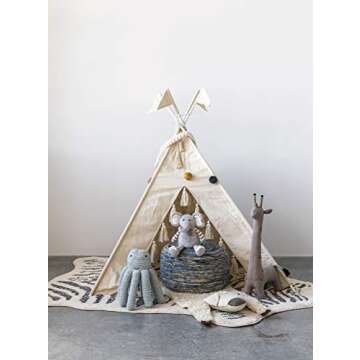 Show moreIntroduce a touch of whimsical charm to your home with the Creative Co-Op Natural Canvas & Metal Teepee with Tassels Toys. This beautifully designed teepee combines functionality with aesthetic appeal, offering a perfect hideout for toys while enhancing your living space. Made from durable natural canvas and sturdy metal, this teepee stands at a generous size of 43"L x 43"W x 63"H, making it an ideal play zone for children of all ages. Its neutral off-white color paired with decorative accents ensures it seamlessly blends into any room – be it a bedroom, playroom, or living room. Not only is this teepee a practical storage solution, but it also serves as an enchanting play area where your kids can unleash their creativity and imagination.