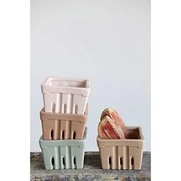 Show moreIntroducing a delightful set of stoneware baskets that are not just functional but also brimming with charm! Crafted from durable stoneware, these baskets promise long-lasting use that withstands the test of time. With a vibrant multicolor design, each piece in the set of four offers a playful splash of color that is sure to brighten any space. Their open top design means you can conveniently see and access all your stored items without any hassle.
