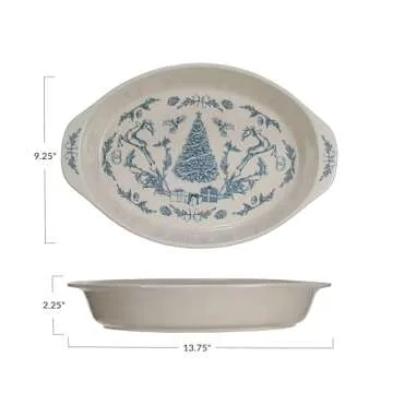 Creative Co-Op Stoneware Handled Baker with Holiday Pattern, Blue and Cream