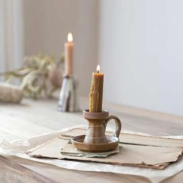 Show moreThis stunning Stoneware Taper Holder with Handle is more than just a stylish piece of decor; it is a testament to fine craftsmanship. Each holder is crafted from high-quality stoneware and features a captivating 💫 reactive glaze finish that makes every piece uniquely yours. The earthy brown tones of the glaze, combined with the organic shape of the holder, embody a rustic charm, making it a perfect accessory for various decor styles including rustic, farmhouse, or bohemian themes.