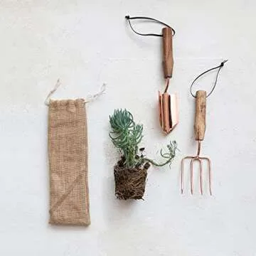 Show moreIntroducing the exquisite Creative Co-Op Tools with Wood Handles in Drawstring Bag, a charming addition to your gardening essentials. This modern farmhouse-inspired set perfectly combines functionality with rustic elegance, making it a standout piece in any living space. Crafted with precision, the tools boast solid stainless steel heads for durability and sleekness, complemented by beautifully finished wood handles that provide a comfortable grip. The stylish leather ties add a touch of sophistication, while the earthy burlap bag allows for easy storage and transport, making these tools not only practical but also a delightful décor item.