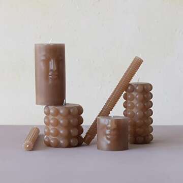 Show moreElevate your home decor with the Creative Co-Op Unscented Face Pillar candle, a stunning piece designed to captivate your guests and illuminate your space. This decorative pillar candle measures a perfect 3 inches in length, width, and height, making it the ultimate centerpiece for any table or shelf. Crafted from 100% paraffin wax, this unscented candle is adorned with an intricately carved silhouette of a face, offering an artistic feel that seamlessly blends elegance with contemporary design. The rich cappuccino hue adds warmth, creating a cozy ambiance in your home without overwhelming your senses.