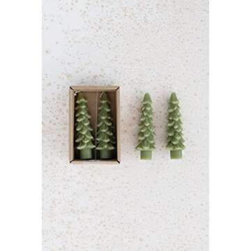 Show moreIlluminate your holiday season with the Creative Co-Op Unscented Tree Shaped Taper Candles, featuring a stunning cedar green hue that captures the spirit of Christmas perfectly. Designed to resemble miniature pine trees, these taper candles add a touch of festive charm to any decor. Crafted from 100% paraffin wax, they ensure a clean and consistent burn, enriching your celebrations with their warm glow. Each candle measures 2 inches in length and width, and stands at 5 inches tall, making them an ideal size to accentuate your holiday table settings or mantel displays. With an impressive burn time of approximately 5 hours, you can enjoy the ambiance without interruption, allowing you and your loved ones to bask in the holiday cheer. Delivered in a chic box, they also make for a lovely gift to share the joy of the season!