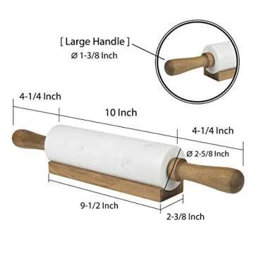 Show more Unleash your baking potential with the Creative Home Deluxe Natural Marble Rolling Pin, a kitchen essential designed for both amateur cooks and culinary professionals. Measuring at a generous 2-3/4" diameter x 18" length, this elegant rolling pin is hand-crafted from genuine natural marble that not only provides superior rolling capabilities but also adds a touch of sophistication to your kitchen. Featuring a solid acacia wood handle on each side, it ensures a comfortable grip and effortless maneuverability while you roll out your favorite doughs, whether it’s for pizza, pastries, or pie crusts. The included wooden cradle is a functional addition that keeps your rolling pin in an upright position when not in use, preserving its elegance and ensuring longevity.