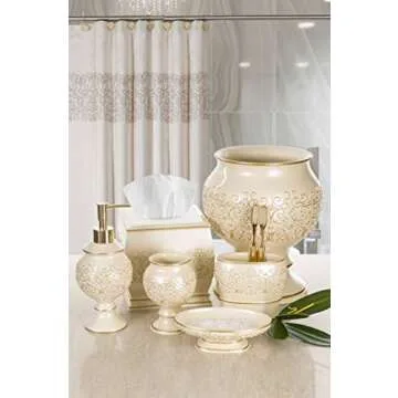 Transform your bathroom into a sanctuary of elegance with the beautifully crafted Beige and Gold Shannon Style Tissue Holder. This stunning addition provides not only functionality but also enhances the aesthetic appeal of your space. Made from the highest quality resin, it boasts exquisite detailing that speaks volumes about craftsmanship. The graceful design is perfect for those who appreciate the finer things in life and want their bathroom decor to reflect that. This decorative tissue...