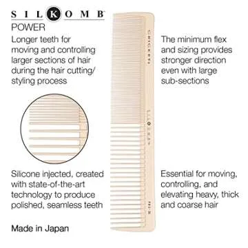 Show more Introducing the Ultimate Power Comb, a product that transcends ordinary grooming tools. Crafted with precision in Japan, this comb is made from silicone-injected material, utilizing advanced molding techniques that enhance both durability and performance. The Silkomb Pro-30 Power Comb features finely polished, seamless teeth that glide effortlessly through any type of hair. Say goodbye to the days of pulling and snagging; this comb is designed for an exceptional styling and cutting experience that allows for smooth operation whether you're working on fine or thick hair.