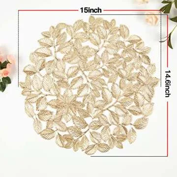 Show more Welcome to the world of elegant dining with the **Crisjanggo Metallic Placemats Set of 6**. Designed to enhance your table decor with a touch of glamour, these stunning gold leaf-shaped placemats are perfect for any occasion. Measuring **15 x 14.6 inches**, they are large enough to accommodate various tableware, while their stylish hollow-out leaf design adds a modern and chic accent to your parties, wedding receptions, and birthday dinners. Crafted from high-quality vinyl, these placemats not only offer a visually appealing layer to your table but also ensure effective protection for your surfaces against spills, scratches, and heat.<\/p>