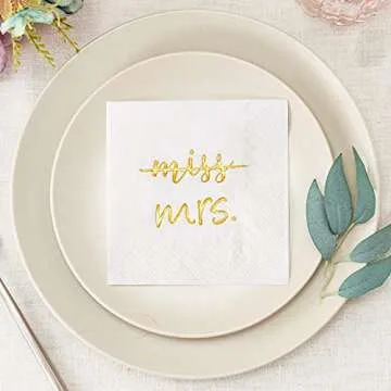 Show more Celebrate the journey from Miss to Mrs. in style with our Crisky Gold Foil Miss to Mrs Cocktail Napkins. Perfectly designed for a variety of special occasions such as bridal showers, engagement parties, and bachelorette celebrations, these exquisite napkins not only serve a practical purpose but also add a touch of elegance to your event. Made from high-quality 3-ply material, the size of these napkins is a convenient 4.9 inches when folded, ensuring they are not only functional but also visually appealing. The stunning gold foil stamped text catches the light beautifully, making them a chic addition to any dessert or beverage table setup.