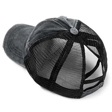 Criss Cross Ponytail Baseball Cap for Women Trucker Hats Mesh Adjustable High Messy Bun Ponycap Washed Distressed Dad Hat (Black, One Size)