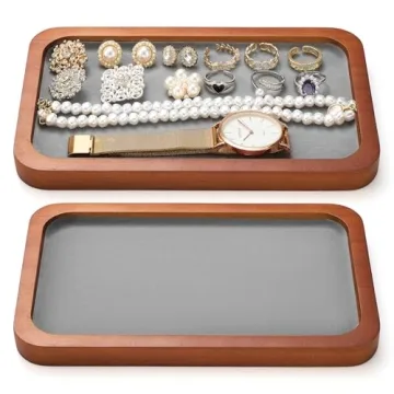 Show more Introducing the CroBlissful 2 Pack Solid Wood Jewelry Display Tray – a stunning combination of elegance and functionality designed to bring order and grace to your personal space. Crafted from high-quality solid wood, these trays feature a beautiful gray velvet lining that exudes a premium feel, ensuring your jewelry, accessories, and other small items are displayed with care. With dimensions of 8.3 x 5.1 x 0.6 inches, these trays are perfectly sized to fit in any space while providing just the right amount of sophistication.