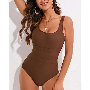 Cromi One Piece Bathing Suit for Women Tummy Control Swimsuit Scoop Neck Square Back Monokini Brown S