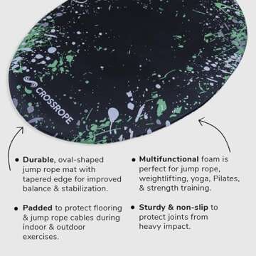Show moreIntroducing the perfect companion for your fitness journey, the durable oval-shaped jump rope mat designed to enhance your workout experience. Crafted with a tapered edge for improved balance and stabilization, this mat is essential for both indoor and outdoor exercises. Measuring 54” x 36” x 1/4”, it comfortably accommodates various activities such as jump rope, weightlifting, yoga, Pilates, and strength training. The thickness of the mat provides significant protection for your flooring and jump rope cables, ensuring that your exercise environment remains safe and clean.