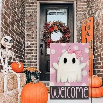 Show more Transform your outdoor space this Halloween season with the CROWNED BEAUTY Halloween Garden Flag. Measuring 12x18 inches and made from high-quality burlap, this charming garden flag features delightful pink polka dots complemented by an enchanting ghost design. Perfect for anyone who wants to add a festive touch to their garden, lawn, or patio, this double-sided flag ensures that your Halloween greetings are visible from every angle. The durable fabric withstands various weather conditions while still maintaining its vibrant colors, making it an excellent choice for outdoor display.