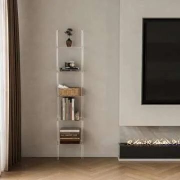 Show more Introducing the CRTERICX Small Acrylic Ladder Bookshelf – a stylish and functional storage solution designed specifically for modern living. Crafted from premium acrylic material, this bookshelf stands out with its elegant transparency and durability. You can say goodbye to peeling veneers and embrace the beauty of a material that complements any decor style. Whether you're decorating your living room, office, or even your bathroom, this bookshelf makes a statement while providing ample display and storage options.