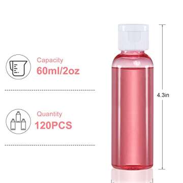 Show more Experience travel like never before with our stunning transparent pink travel toiletry bottles. These bottles are not just a pretty sight; they are expertly crafted from top-quality PET plastic, ensuring durability and excellent sealing. Lightweight and space-saving, these bottles are a must-have for anyone who is constantly on the move. Whether you're heading for a weekend getaway or a business trip, their 2 oz/60ml capacity is just perfect for carrying your essential liquids.