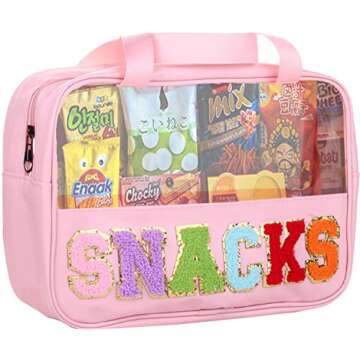 CRUOXIBB Chenille Letter Clear PVC And PU leather Large Travel Cosmetic Toiletry Storage Bag Waterproof Makeup Tote Bag Organizer Bag for Women(SNACKS-Pink)