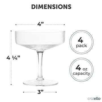 Crutello Ribbed Coupe Glass - 7oz Classic Coupe Cocktail Glasses for Champagne, Martini, Manhattan, Cosmopolitan, Frozen Drinks - Ribbed Glasses Set of 4