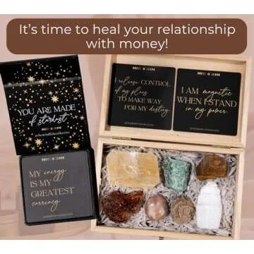 Show more Immerse yourself in the captivating world of abundance with our premium Healing Stones and Crystals Set. Specially curated for those seeking to heal their relationship with money and manifest the wealth they dream about, this set combines the potent energies of real crystals with empowering daily affirmations. Each crystal has been carefully selected for its unique ability to attract and amplify prosperity energies, ensuring you are not just hopeful for abundance but energetically aligned with it.
