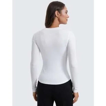 The shirt features a trendy five-button henley neck that adds an element of sophistication to the traditional long sleeve design while offering the flexibility to adjust your look. The long and curved hem not only enhances your silhouette but also allows for comfortable movement, perfect for a busy lifestyle. Engineered to transition seamlessly from workout sessions to brunch dates, this top embodies the perfect fusion of comfort and style.
