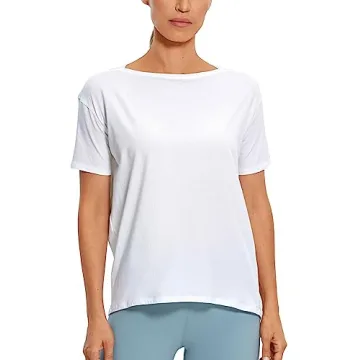 Show moreIntroducing the **CRZ YOGA Women's Pima Cotton Short Sleeve Shirts** - the perfect blend of comfort and style for your low-impact workouts or daily casual wear. Crafted from super soft, skin-friendly, and lightweight fabric, this athletic t-shirt ensures all-day comfort whether you're hitting the gym or lounging at home. The loose fit and hip-length design provide a relaxed silhouette that flatters every body type while allowing for freedom of movement. With a chic boat neck that beautifully outlines your face, you can transition seamlessly from workout to everyday activities with flair.