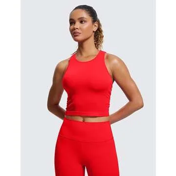 CRZ YOGA Womens Seamless Ribbed Longline High Neck Sports Bra - Racerback Padded Slim Fit Crop Tank Top with Built in Pads Deep Red Medium
