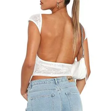 CSDAJIO Women's Sexy Floral Lace Open Back Crop Top See Through Backless Shirt Without Bra Lace White Large