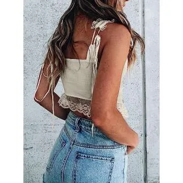 CSDAJIO Women's Sexy Sleeveless Lace Tirm Open Front Tie Up Crop Top Asymmetrical Hem Tank Shirt Beige Small