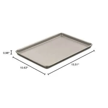 Designed with thick rolled edges that prevent warping, this baking sheet is a robust companion for all your baking adventures. It is engineered to withstand high temperatures, so you can bake with confidence, knowing it won’t bend or curl in the oven. Plus, its stylish champagne finish adds a touch of elegance to your kitchen décor.