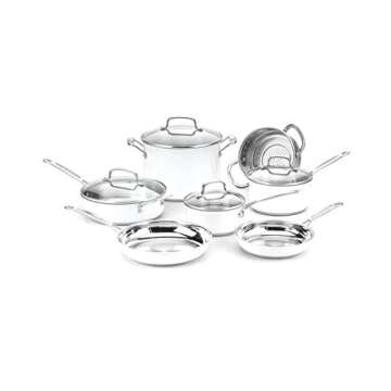 Show moreExperience the ultimate in culinary performance with the Cuisinart Chef's Classic Stainless Color Series 11-Piece Set in White. This stunning cookware collection is designed for everyday use and offers exceptional quality, performance, and aesthetic appeal. Featuring an aluminum encapsulated base, this set heats quickly and effectively, ensuring your meals are cooked evenly without the frustration of hot spots. The stainless steel cooking surface is not only visually appealing, but it's also non-reactive, meaning your foods will retain their natural flavors and won’t discolor over time. With solid stainless steel riveted handles that remain cool on the stovetop, handling this cookware is both safe and comfortable.