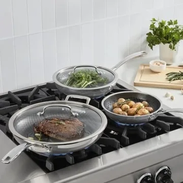 Show more Introducing the Cuisinart FusionPlus Nonstick Stainless Steel Cookware Set, an essential addition to any kitchen! This five-piece skillet cooking set includes 8", 10", and 12" skillets, each equipped with matching lids for the larger sizes. Crafted with professional-grade stainless steel, the polished exterior not only gives it a sleek look but also ensures resilience against daily use. The aluminum-encapsulated base guarantees even heating, eliminating hot spots and ensuring your meals are perfectly cooked every time.