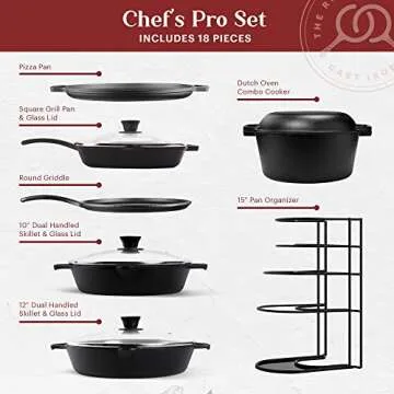 Cuisinel Cast Iron 18-Piece Preseasoned Cookware Set: 10"+12" Skillets w/Lids + 5-Qt Dutch Oven + 10.5" Square Grill Pan w/Lid + Pizza Pan + Round Griddle + 15" Organizer +Scraper + Silicone Handle