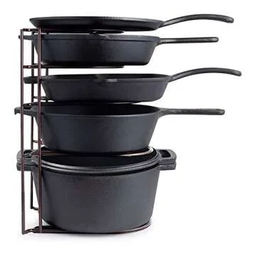 Show more Introducing the Cuisinel Heavy Duty Pan Organizer, a unique kitchen accessory that combines functionality, strength, and style all in one! Designed specifically for culinary enthusiasts, this extra-large 5-tier rack is perfect for keeping your kitchen organized and tidy. With the ability to hold everything from cast iron skillets to dutch ovens and griddles, you'll find that maintaining an orderly kitchen is easier than ever. Crafted from durable materials, this pan organizer is built to withstand the weight of even your heaviest cookware, making it a reliable investment for years to come.