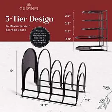 Show more Introducing the ultimate solution for kitchen organization - the Cuisinel Pots and Pans Organizer Rack. This revolutionary rack is designed to redefine cookware storage, ensuring you have the most efficient and elegant solution for your culinary space. Crafted by the reputable Cuisinel brand, this organizer features an impressive 6mm thickness, which is twice as strong as typical pan racks available on the market today. With its robust design, it can accommodate not just cast iron frying pans and enamel dutch ovens but also cutting boards, lids, and baking pans, making it a truly versatile kitchen accessory.