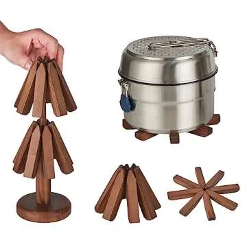 Show more Introducing the exquisite CUIYAKI Bamboo Trivet Set, a delightful fusion of practicality and nature's charm that will elevate any kitchen experience. Crafted with care, this handcrafted bamboo trivet set resembles a charming little Christmas tree, adding a touch of whimsy and elegance to your dining space. Designed to not only please the eye but also protect your surfaces, the trivets are perfect for safeguarding your countertops from the heat of pots, pans, and kettles. Each set includes three round trivets, each 8.2 inches in diameter and 1 inch thick, making them both compact and effective in their function. When stacked, this whimsical tree stands at an impressive height of 10.5 inches, allowing for easy storage and delightful decoration when not in use.
