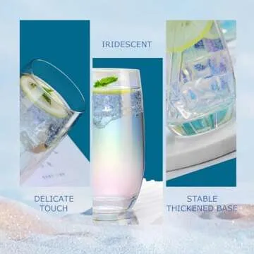 Show more Discover the enchanting world of your favorite beverages with our Premium European Drinking Glasses. These six exquisite glasses are crafted by fine European artisans, showcasing a subtly iridescent surface that captures and reflects light in a spectacular array, reminiscent of a fine gemstone’s prismatic glow. Each sip from these glasses isn’t just about drinking; it's an immersive experience filled with elegance and sophistication.