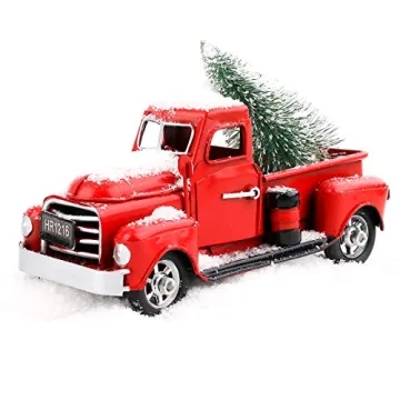 Cullaby Red Metal Pickup Truck Car Model for Christmas Decorations Table Top Decor Christmas Truck, Little Red Truck Christmas Decor with Mini Christmas Trees (6.7 '', Horror)