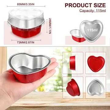 Show moreIntroducing the Cunhill 60 Sets Heart Shaped Cake Pans with Lids, the perfect solution for anyone looking to spread love through baking! This set includes a whopping 60 heart-shaped aluminum foil pans that come equipped with lids, each perfectly sized at approximately 3.35 x 2.87 x 1.1 inches with a capacity of 3.4 ounces (100 ml). Whether you're preparing delightful desserts for a romantic dinner, a wedding celebration, or simply indulging your passion for baking, these versatile pans make it easier than ever to create heartwarming treats that are beautiful and delicious. Crafted with a smooth surface and an eye-catching metallic finish in shades of gold, red, pink, and white, these pans not only enhance the visual appeal of your confections but also ensure utmost convenience and cleanliness while baking.