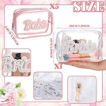 Show moreIntroducing the Cunno 6 Pcs Bride and Babe Bachelorette Makeup Bag, an essential for any glamorous wedding event or bachelorette party! These chic clear toiletry bags come beautifully designed with exquisite rhinestone patch letters, creating an elegant and attractive appearance that will surely catch the eye of your guests. Perfect for holding your essentials, these bags measure about 7.8 x 2.2 x 5.5 inches, making them ideal for storing makeup, toiletries, cell phones, and keys. Each set includes six stylish bags organized with BRIDE and BABE themes, serving both practicality and aesthetic with every use. The quality of craftsmanship ensures that these bags stand out from the rest, giving brides and bridesmaids a fashionable way to organize their belongings.