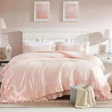 Cupocupa Blush Pink Comforter Set Queen, 3Pcs Comforters Queen Size Ruffle Farmhouse Bedding Sets Queen with Comforter, Lightweight Soft Shabby Chic Bedding Comforter Set Fluffy for All Season
