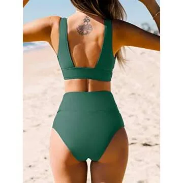 CUPSHE Bikini Set for Women Two Piece Swimsuit High Waisted V Neck Ruched Front Wide Straps M, Green