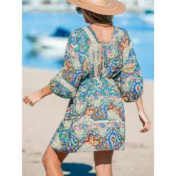CUPSHE Women Casual Boho Sundress Summer Floral Print Tie Front Dress 3/4 Sleeves Paisley Beach Mini Dresses