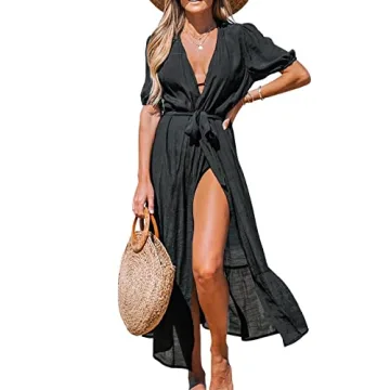 CUPSHE Women Open-Front Cover-Up Kimono Short Sleeves Cover Up Dress Casual Summer Longline Hem Cover Ups,S Black