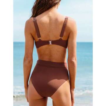 Show more Discover the perfect blend of style and comfort with our stunning Knotted Coffee Brown Back Hook Top and High-Waisted Low Cut Belted Bottoms, brought to you by CupShe. This exquisite swimwear set is crafted from a unique specially designed Jacquard fabric that not only looks fabulous but also feels soft against your skin. Its adjustable straps ensure a perfect fit, allowing you to enjoy every moment at the beach or poolside without any discomfort. The removable pads in the top provide added versatility, giving you the option to customize your support level.