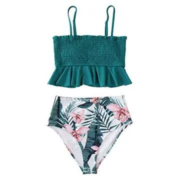 Show moreThis stunning CUPSHE Women's High Waist Ruffle Two Piece Bathing Suit is designed for the modern woman who seeks both style and comfort. The smocked bikini top features adjustable straps, ensuring a perfect fit that allows for customizable support. The high-waisted bikini bottom not only offers a flattering silhouette but also showcases a beautiful and unique leaf print that adds a touch of tropical flair to your beach look.