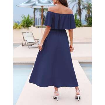 Show moreTransform your summer style with the CUPSHE Women's Off The Neck Short Sleeve Solid A Line Slit Maxi Dress. This stunning navy blue maxi dress beautifully showcases a unique A-shaped design that features chic off-shoulder sleeves, perfectly framing your shoulders for an effortlessly elegant look. Tailored for comfort and style, this dress is designed with a flattering ruffle and a daring side slit that enhances your silhouette, making it a standout piece for any occasion. The elastic waist ensures a perfect fit, so you can confidently flaunt your figure while enjoying the breezy comfort of fabric made from 95% polyester and 5% spandex, which offers you a soft and smooth touch against your skin. This dress is not just a clothing item, it's a statement that brings a refreshing vacation vibe to your summer wardrobe!
