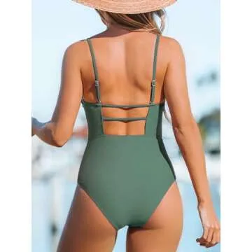 CUPSHE Women's One Piece Swimsuit Square Neck Cutout Back Tummy Control Adjustable Straps Striped Swimwear, L Sage Green