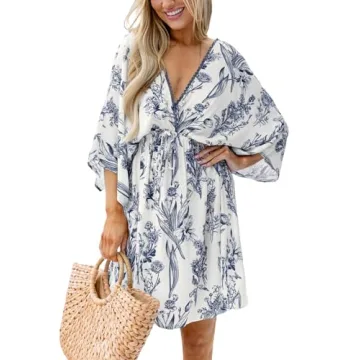 Show more Introducing our exquisite Romantic Plunging V Floral Dolman Sleeve Loose Mini Dress Cover Up, a fresh addition to your summer wardrobe that effortlessly combines style with comfort. Crafted from 100% Rayon, this dress is not only soft to the touch but also boasts **lightweight quality fabric** that keeps you cool during those warm sunny days. The unique plunging V neckline adds a touch of allure, while the short dolman sleeves ensure a relaxed fit that flatters every body type.