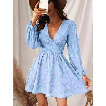 Show more Elevate your wardrobe with the stunning CUPSHE Women's V Neck Lace Mini Dress, a perfect blend of sophistication and style crafted from 100% high-quality Polyester. This light blue dress offers unmatched softness and comfort, making it an ideal choice for those long summer days and vibrant nights out. The unique floral shadow print beautifully accentuates its elegant design, while the plunging V-neckline and semi-sheer long peasant sleeves add a touch of allure and femininity. Its A-line silhouette flatters every body type, ensuring you look your best at any event.