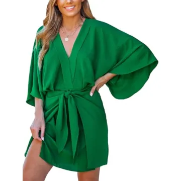 CUPSHE Women's V Neck Summer Dress 3/4 Kimono Sleeve Self Tie Pleated Loose Slit Mini Casual Dress Green, S